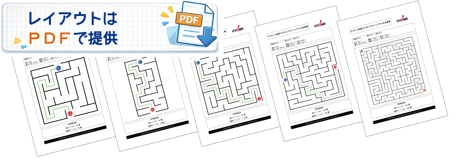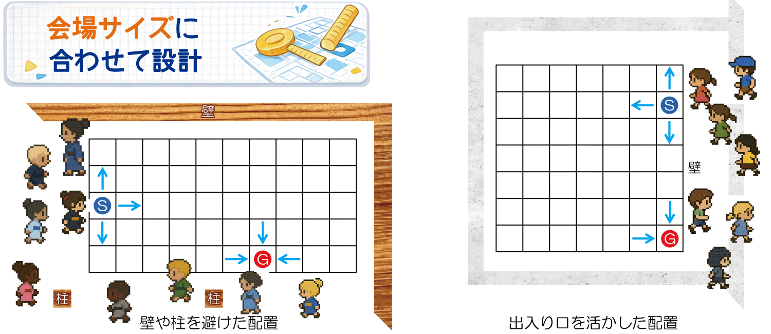 会場の壁・柱・ドア位置などの制約や、設置可能マス数に合わせて調整することで、より安全に、より楽しい迷路運営が実現できます。